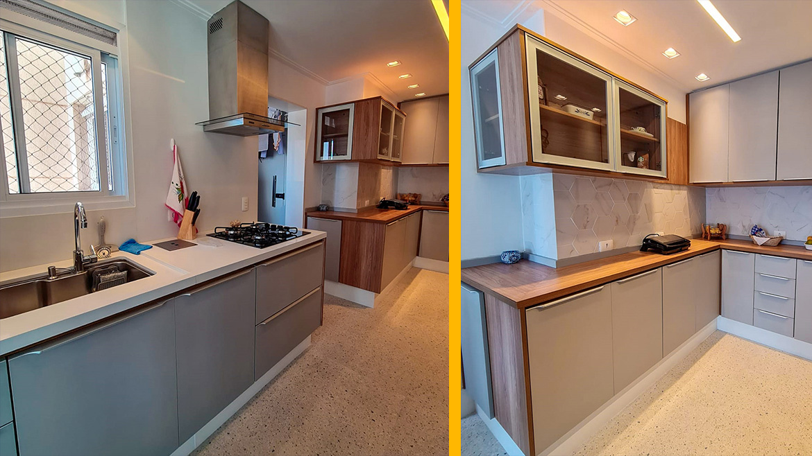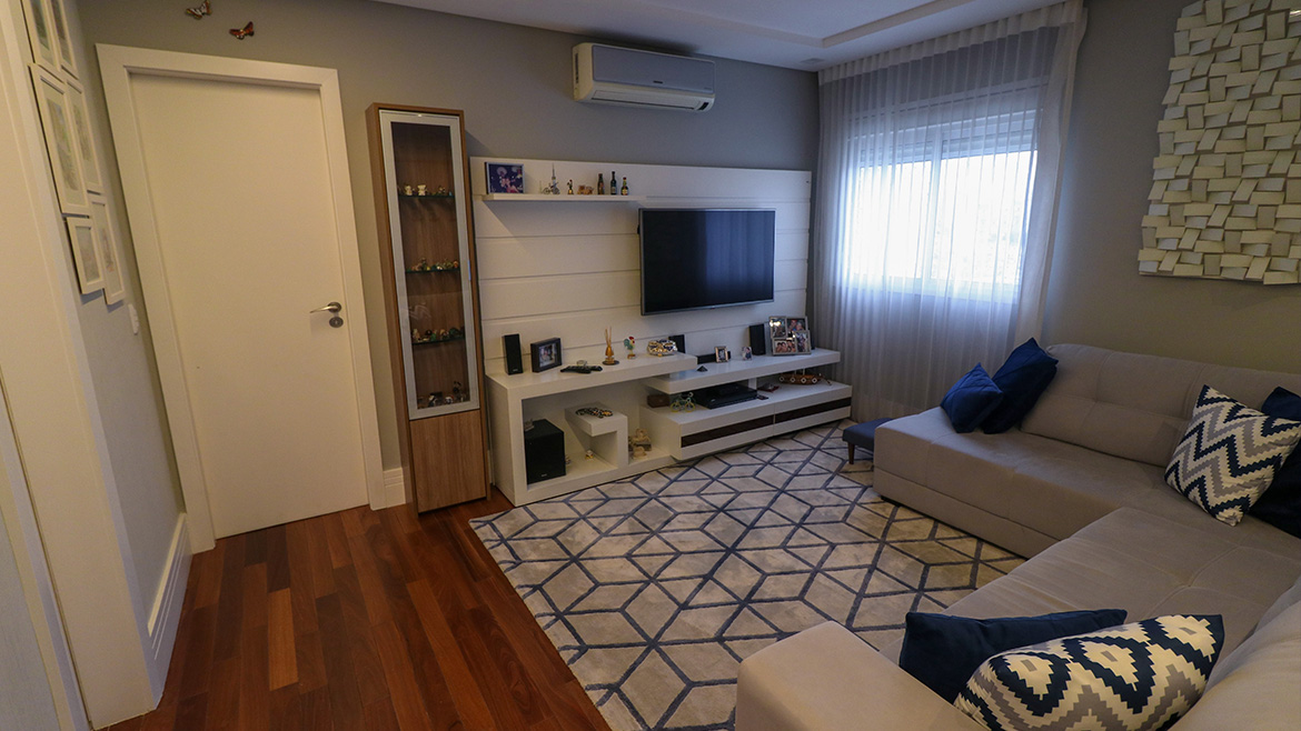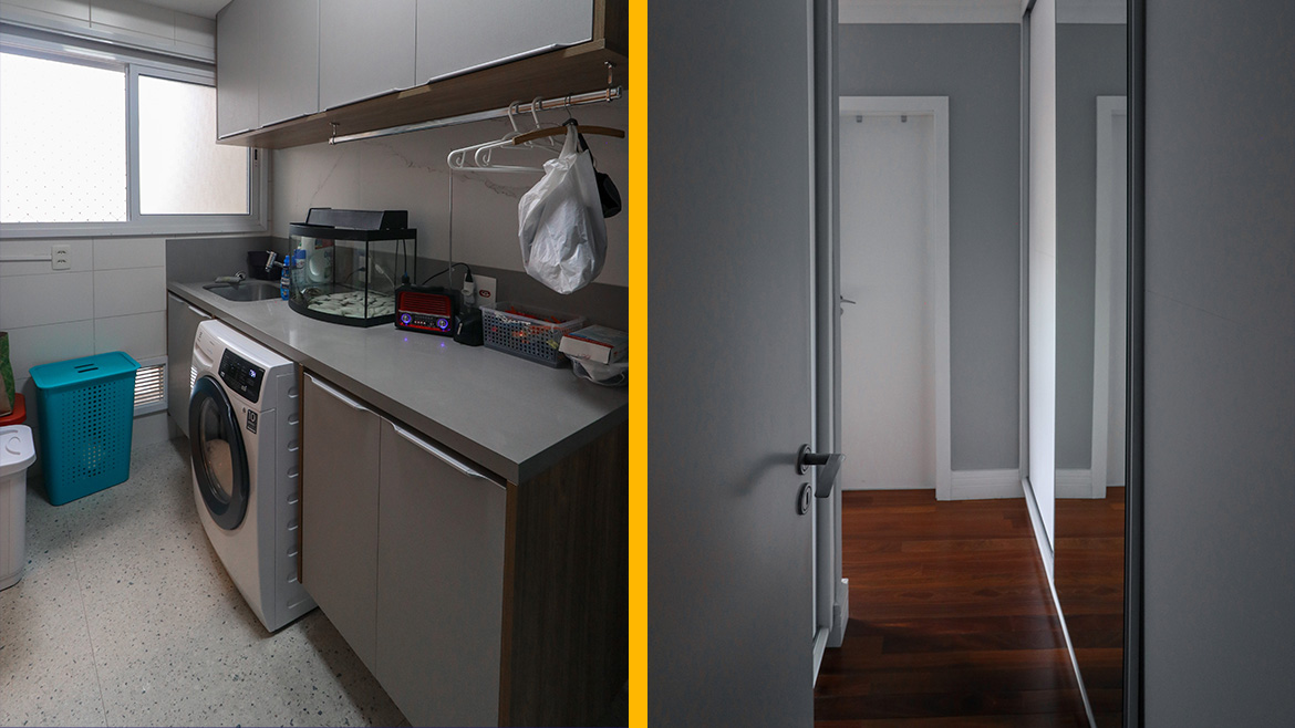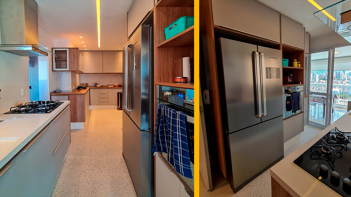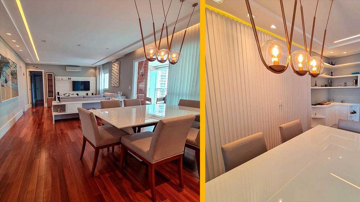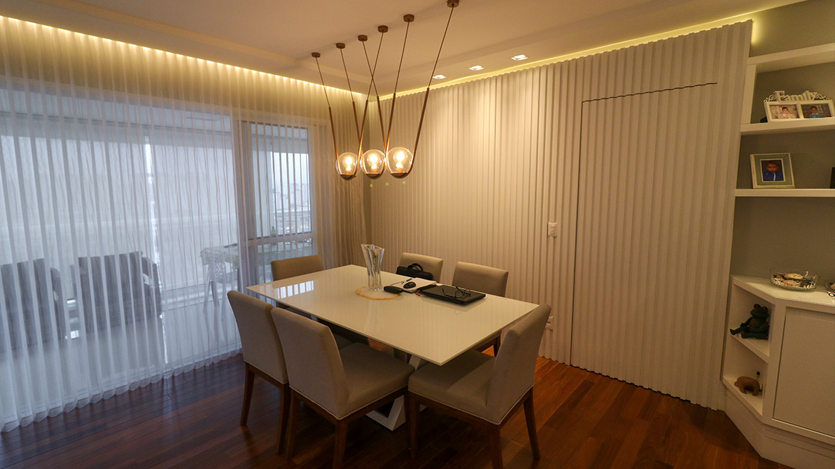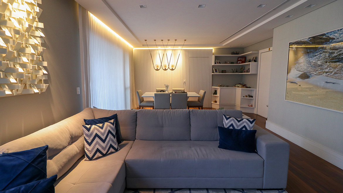 Sala com 2 ambientes integrados com um móvel de apoio para o sofá. Destaque para painel ripado branco com porta oculta para a cozinha.