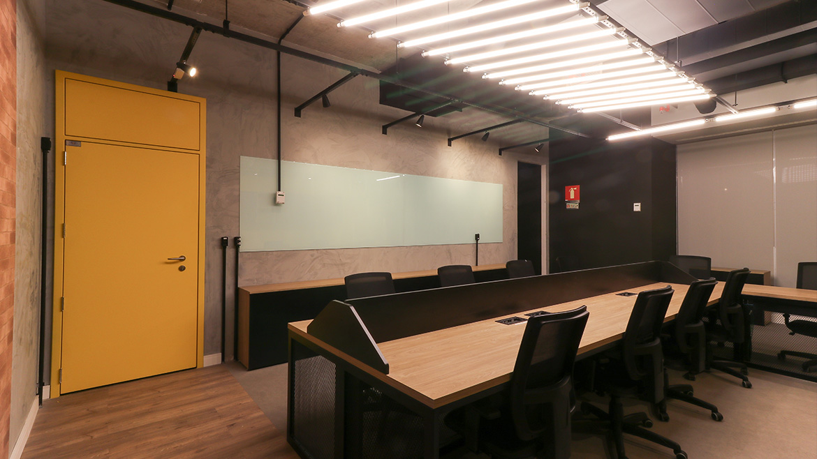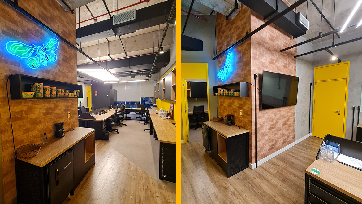 Grande desafio de instalar um estúdio de gravações numa laje corporativa foi a questão acústica, pois foi necessário executar paredes de Dry Wall de placas duplas além de lá de alta densidade para que o som das gravações não fosse afetado. O fundo infinito sem quinas evidentes também foi desenhado e executado por nossa equipe pois com essa pintura verde especial é possível após a filmagem inserir qualquer fundo na edição. Lembrando que ter esse recurso próprio durante a pandemia foi muito bom pois ajudou eles a conseguir gravar as produções mesmo sem acesso aos lugares que depois eram acrescidos em gravação.